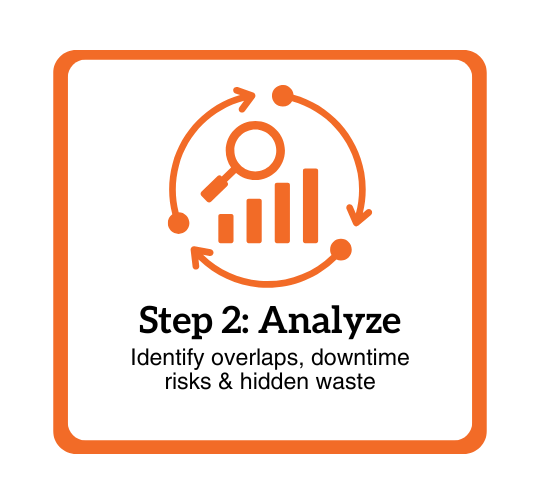 Example report showing current spend, overlaps, downtime cost, and estimated savings.